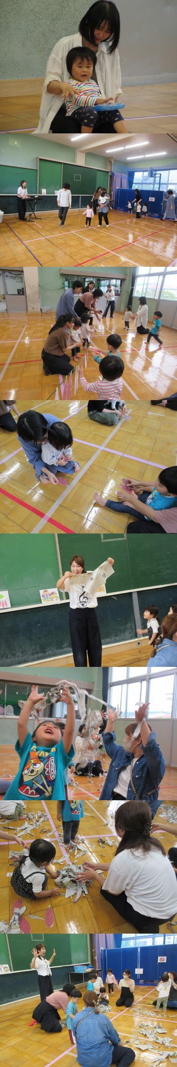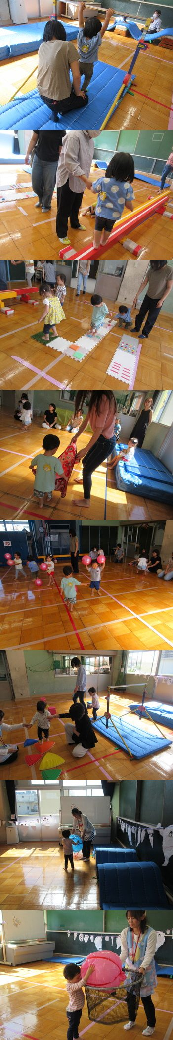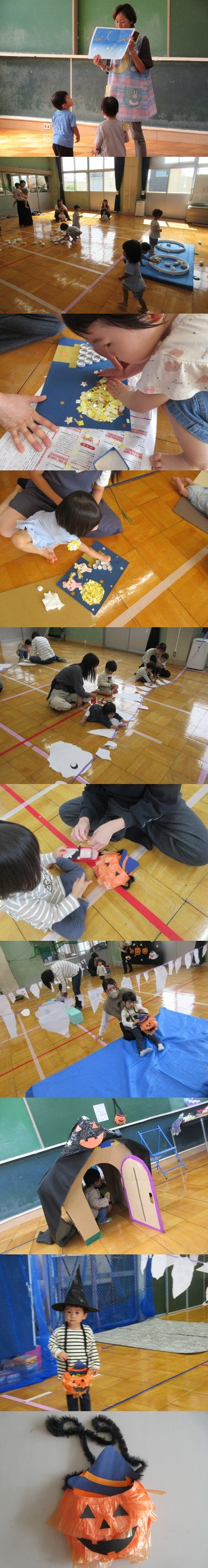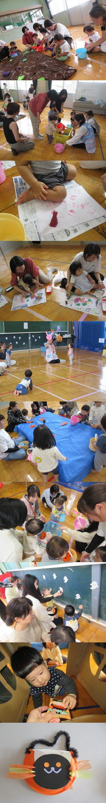 22日:ハロウィンにちなんで部屋中いっぱいのお化けが~!みんなで自由にいろいろな形の目を貼ってクレヨンで口を書きました。いろんな表情のお化けが現れました。紙皿を使ったジャックオランタンのかばんも作りました。タフロープを指先を使ってさいてからパーツを貼りました。嬉しそうに肩からかけてからお化け見つけです。目がくるくる動くおばけがお部屋のあちこちに・・・。張り切って見つけると「あったよ」と見せにきてくれました。最後におうちの扉をたたいてお菓子をもらって手作りかばんに入れて持って帰りました。ハロウィン飾りの前で衣装をつけて写真を撮る子もいましたよ。 |