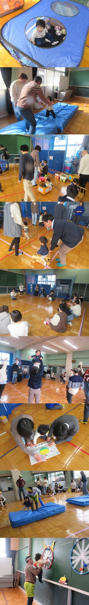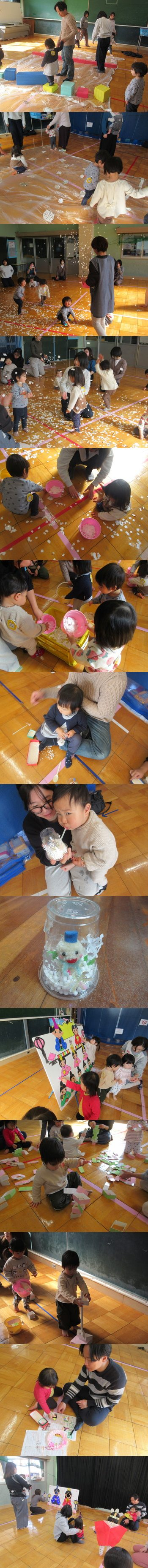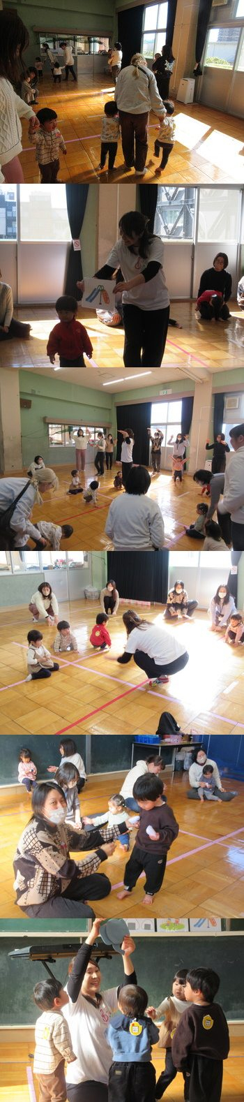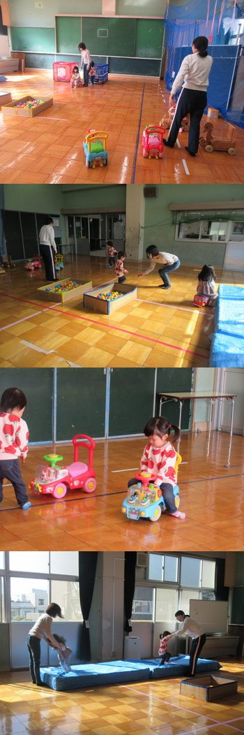 12日:たくさん穴をあけた大きなビニールシートをひろげてその穴に足を入れて歩きました。穴に引っかかったりしながらも一生懸命バランスを取りながら歩くことができました。最後に子重トレーニングもしてママも体を動かしましたよ。 |