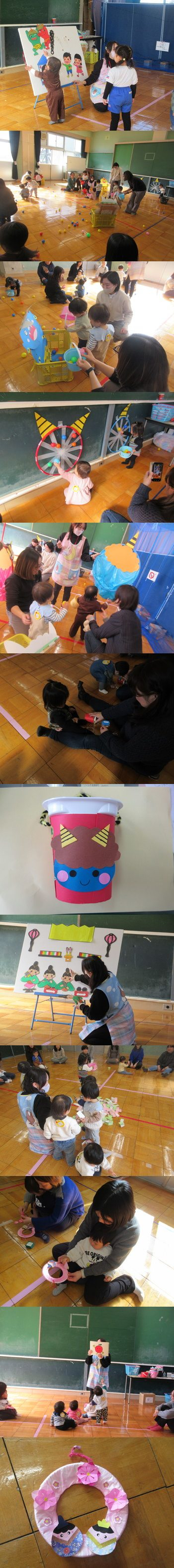 18日:ひなまつりのパネルシアターを見てから牛乳パックで作ったひしもち積み遊びをしました。高く積んで倒したり、3色の色分けしながらお片付けも上手にしてくれました。レースペーパーに色とりどりのR1容器スタンプをして着物のかざりにしてお内裏様とお雛様に着せてリースに飾りました。スタンプは力加減が難しく絵の具がたくさん付いてあたふたする様子もありましたがみんな楽しんできりがないくらいでした。桃の花の飾りをつけて完成すると「見て~」とみんな見せにきてくれました(*^^*) |