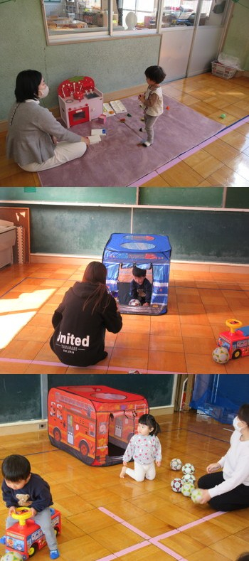 12日:たくさん穴をあけた大きなビニールシートをひろげてその穴に足を入れて歩きました。穴に引っかかったりしながらも一生懸命バランスを取りながら歩くことができました。最後に子重トレーニングもしてママも体を動かしましたよ。 |