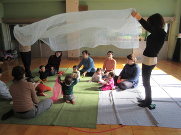 少しずつ両足をそろえてジャンプができるようになる年齢なので、お母さんと手をつなぎ「1,2,3」とタイミングを合わせて練習をしました。 汗をかき、思いきり体を動かして大満足の時間でした。 |