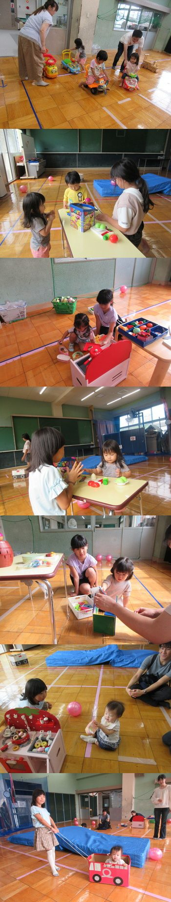 2階遊戯室に広さを利用した遊びをたくさん準備しました。坂道、ボールプール、トンネル、押し車、ままごとなど・・・。小さい子と遊びたい!と楽しみにして毎回小学生の子が来てくれて上手に優しく声掛けして遊んでくれます。恥ずかしくてなかなか小学生の子と目が合わせられない子もいますが時間がたつにつれて遊んでもらうのがとても嬉しい様子でにっこにこで楽しんでいました。お母さんとお話しながら和気あいあいとした雰囲気のなか時間を過ごすことができました。いつもとは違った幼児さんの姿もみることができましたよ。