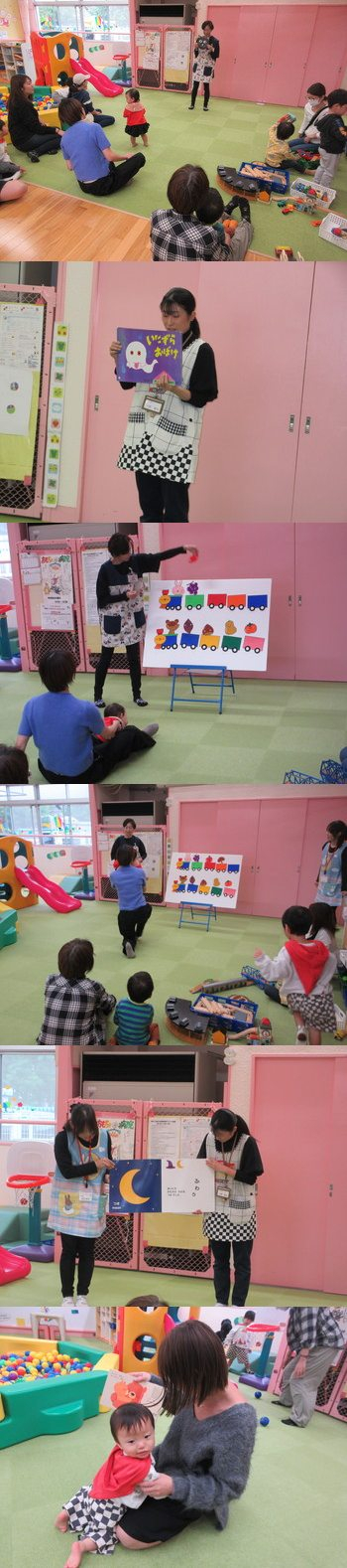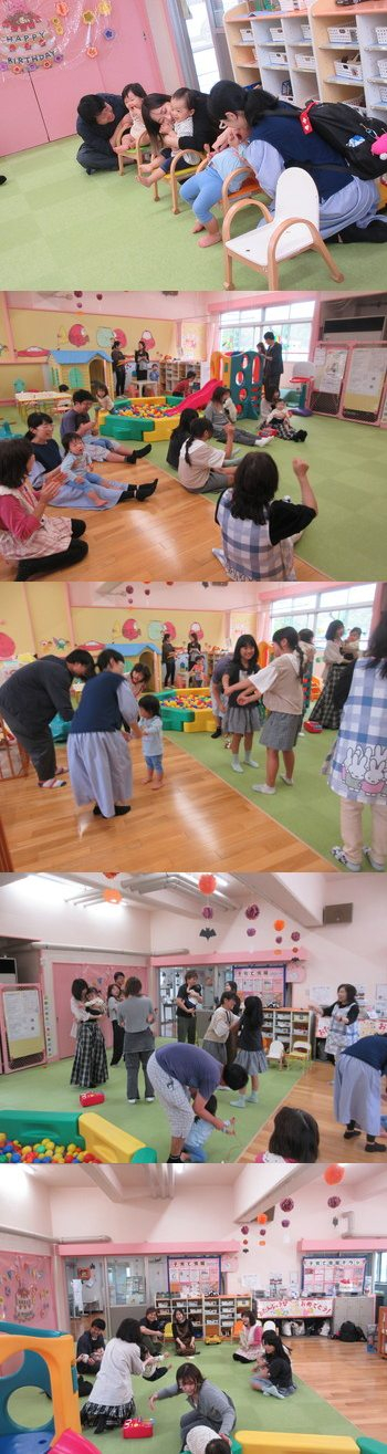 10月生まれの誕生会をしました。誕生日の子にインタビューをして一人ずつ紹介しました。「とっとこさんぽ」「バスにのって」「親子でメリーゴーランド」などふれあい遊びをして紙芝居をみんなで見ました。カラーボールをたくさん出してみんなでボール入れをして盛り上がりました。小学生のお友達も参加してくれ小さい子とふれあいながら一緒にお祝いできました。
