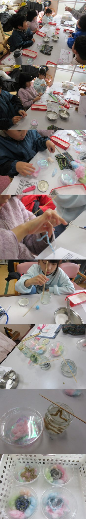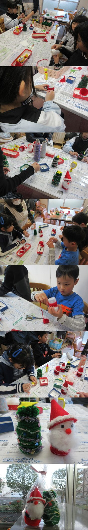 フェルトの帽子を乗せて顔のパーツをつけて・・・仕上げは児童館で育った綿をサンタさんのおひげにしました。天然綿でふわふわして気持ちいい~と喜んでくれました。かわいいサンタさんとツリーが出来上がりました。透明の袋に入れて、ラッピングして持って帰りました。 |