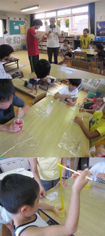 アルミホイルに自分の好きな絵をかいてバケツの水の中に入れるとあらあら不思議・・・書いた絵がまるで幽体離脱のようにはがれ始め紙で救うと転写されました。 どんな形や図や色だとうまくはがれるのかいろいろ試しながら真剣な様子で取り組んでいました。 |