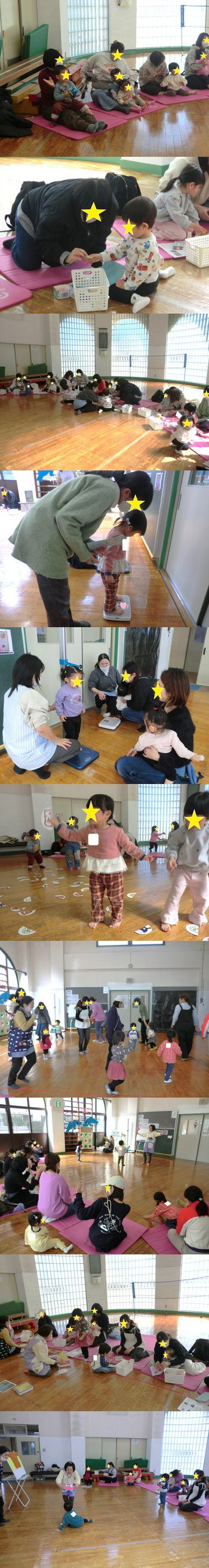 ~10日~ この日は2・3歳の子が多く、ほとんどの子が4月から園に通うため、最後のクラブという子がたくさんいましたよ!みんなで最後に成長をお祝いしたかったので、『おおきくなるっていうことは』の絵本を読みました。集中力があり、親子で楽しくお話を聞いてくれましたよ(*^-^*) 製作後は、みんなで『アンパンマン絵あわせゲーム』をしました☆ どの子もアンパンマンが大好きなので、出たキャラクターを探して絵あわせゲームができましたよ!すごく盛り上がって楽しいクラブにすることができました♪ ~13日~ この日は、ほとんどの子が1歳児でした。集中力が続かないこともあり、ふれあい遊びを3曲やって体を動かしました。その後ペープサートやパネルシアターをいつもより多く取り入れてみました☆いろんな歌や曲が流れるので、親子で楽しい時間を過ごすことができましたよ☺✨ 両日とも「成長カード」を作りました。 たくさんパーツがありましたが、親子で協力し合いながら楽しくカードを作ることができました!手形も自分の好きな色を選んで、上手に押すことができましたよ☺🎵 他にも身長・体重も測りました。ママに見守ってもらいながら、身長計・体重計に乗り『大きくなったね!』と一緒に成長を喜ぶ姿が見られましたよ(*^-^*) 私たち職員も、みんなと一緒に成長を祝うことができてよかったです☆ |