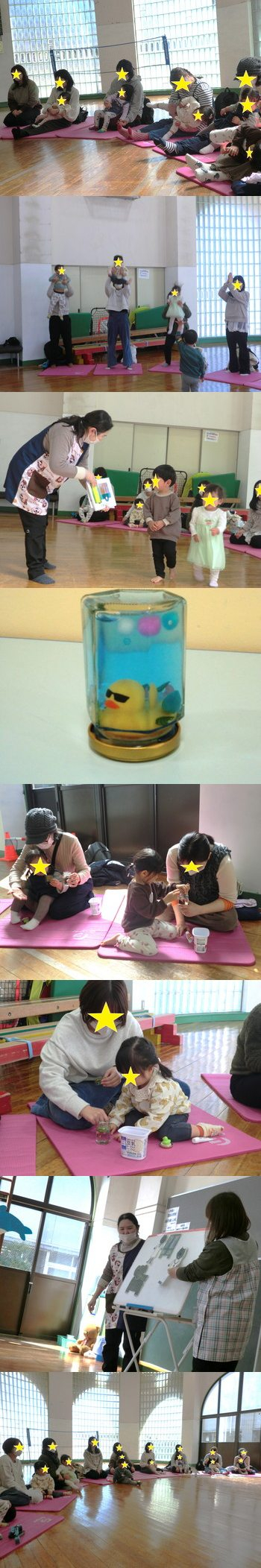 ビンの中にハーバリウム液が入っているので、それを手で触らないように声をかけながら、ラメやビーズ、ポンポン等を入れていきました✨ 親子で「キラキラしてるね~」とお話をしながら、楽しく作ることができました☆ 中に入っているのがハーバリウム液なので、パーツが馴染むまでに時間はかかりますが、馴染んでくると、中のビーズたちがゆっくり動くので癒し効果が出ると思いますよ(*^-^*) 他にも『はたらくくるま』のペープサートをしたり、『ねこのおいしゃさん』のパネルシアターをやったりしました!曲が流れるので、みんなノリノリで楽しく聴いてくれましたよ♪ ~お知らせ~ 4月から「ぐるぐるペッタン」がなくなり、『ミックスクラブ』に変更になります。 『ミックスクラブ』では・・・ 工作の日だったり、講師の先生によるお話を聞いたりします。 月によって行う内容は変わりますので、HPやはみんぐをご覧ください。 分からないことがあれば、職員にお尋ねください。 |