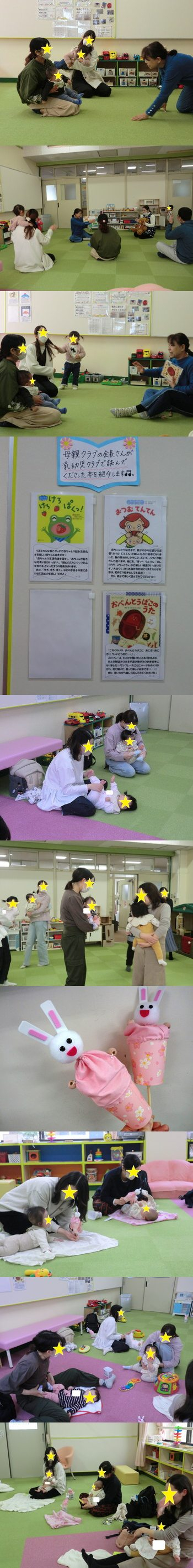 ママに優しく触れてもらえるので、子どもたちも楽しくて満面の笑みでしたよ☺ 今回はちょっとした製作をしました。 『びっくりうさぎ』というパペットを作りましたよ☆ ママ達にはうさぎさんの顔を貼ってもらいました。 ボンドが乾いたら「いないいないばぁ!」をして遊んだりしましたよ(*^-^*) 子どもたちも興味津々でした! 他にも赤ちゃん体操をしました。 毎月やっているので、ママたちも慣れた手つきで優しくマッサージをしてあげていましたよ♪子どもたちは気持ちいいのか眠そうにしている子もちらほらいました。 今月はお話し好きのママたちが多くいらっしゃったので、自己紹介ゲームをしながらワイワイ楽しく交流することができました✨ 話が盛り上がると、自然に笑顔も増え、ママたちもいい気分転換になったと思います☆こういう機会を大事にして、今後も交流ができるといいですね! 今月の絵本は 『けろ けろ ぱくっ!』 『おつむ てんてん』 『おべんとうばこのうた』の3冊を紹介していただきました。 特に『おべんとうばこのうた』は、手遊びにもなっているので、 読みながら遊ぶこともできますよ♪ ぜひ、読んでみてくださいね✨ |