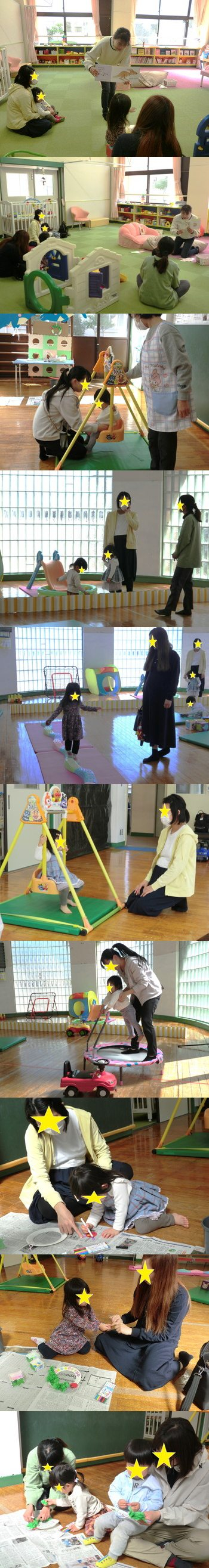 みんなが楽しめる絵本を何冊か読んだり、曲に合わせてラミネートシアターをやったりしました☆ おもちゃで遊んでいる子も読み聞かせが始まると、じーっと絵本の方をみて聞くことができました。また、音楽がかかるとママも一緒になって、みんなで楽しく歌を口ずさんだりすることもできましたよ♪ 読み聞かせの後は遊戯室に移動をし、マット(山登り)・サイコロ・トランポリン・すべり台・バランスブロック・テント・ブランコ・キッズカー・製作といった各コーナーを用意しました。 ママたちの交流もありつつ、お友達と楽しく遊ぶ姿もたくさん見られました。両日とも暖かかったこともあり、たくさんの方が参加して楽しく遊んでくれましたよ(*^-^*) 今回の一番人気は、キッズカーとテントでした☆ 製作では、春をイメージした桜のタペストリーや3月のカレンダー作りをしました。柄の入った折り紙や、春にちなんだパーツをたくさん準備していたので、好きなものを選んで楽しく飾りつけをすることができましたよ☺ |