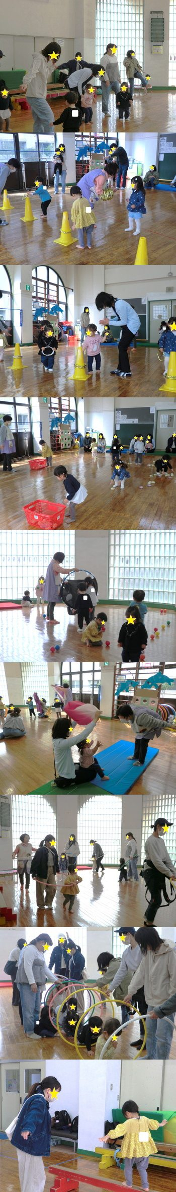 『どうぶつ体操』 『ぴよぴよ行進曲』 『バナナ星人』 『親子でメリーゴーランド』 『みんなであそぼ』の5曲から始まりました。 音楽に合わせて、みんなで楽しく踊ることができましたよ♪ 水分補給をして休憩した後は、輪っか入れ・お手玉入れ・ボール投げの3つの『よーいドン!』をしました。お友達にぶつからないように、たくさんお手玉やボールを拾って上手に投げ入れることができました! 他にも風呂敷を使ってかくれんぼをしたり、ふわっとさせて遊んだりもしました。ママが風呂敷をかぶって隠れると、不安そうな顔をする子もいましたが、パッと顔を見せてあげるとすぐ笑顔に戻る子もいました。ママの存在は偉大だなと改めて実感しました(*^-^*) その後はみんなが大好きなフープを使って、曲に合わせて親子で電車ごっこをしました!ノリがいい曲なので、子どもたちも満面の笑みですごく楽しそうでした☆ 電車ごっこの後はママたちに協力してもらって、フープトンネルを作りましたよ! みんな順番に並んで、楽しくトンネルの中を通ることができました♪ また次回もやりましょうね☺✨ |