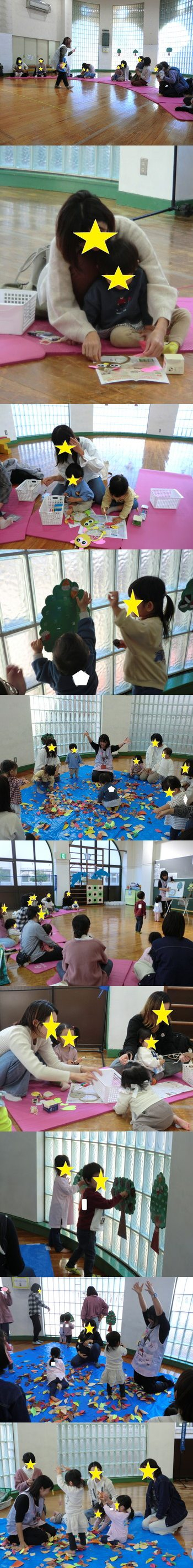 マグネットシアターを使って 『まつぼっくり』 『大きな栗の木の下で』 『どんぐりころころ』の3曲をやりました。 どの曲も秋になるとよく聴く曲だからか、みんなで一緒に歌ったり、手遊びをして楽しむことができました♪ 製作では「ふくろうのしあわせチャーム」を作りました。 ふくろうは縁起が良いとされるものなので、親子で協力して可愛いふくろうを作ることができました! ぜひ、お家に飾ってくださいね☆ その後は、本物の枯れ葉と作った葉っぱを混ぜて「葉っぱあそび」をしました。触った時の感触や音が新鮮ということもあり、みんなで大いに盛り上がりながら遊ぶことができました(*^-^*) 他にも、その葉っぱの中から、栗・まつぼっくり・どんぐり見つけをしました。みんなでどんどん見つけて、木にペタペタ貼っていくことができました☆ 楽しく秋あそびをすることができてよかったです! |