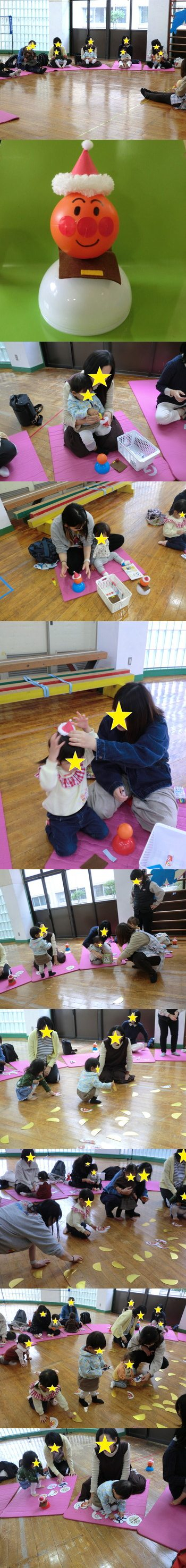 「アンパンマンのペーパーウエイト作り」でした。 ペーパーウエイトとは、紙の上に置いて飛ばないようにするための重りのことです。 みんなが大好きなアンパンマンで作ってみました☆ ママと一緒に、シール貼りをしてアンパンマンの顔を作ったり、サンタの帽子をくっつけたりして、楽しく作ることができました(*^-^*) その後は『アンパンマンの絵あわせゲーム』をやりました。 サイコロを振ってもらい、出たキャラクターの半分を見つけてもらいましたよ! カードが裏向きになっているので、ママと一緒にひっくり返して、楽しく見つけることができました☆ みんなで楽しく思う存分遊ぶことができましたよ♪ |