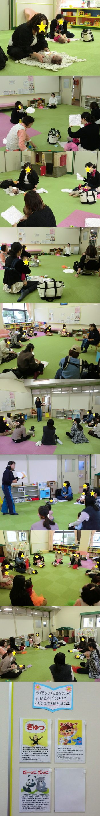 この日は、講師の先生による『ねんねの話』をしてもらいました。 赤ちゃんは、みんなよく寝ると思っていませんか? 実は...夜泣きが続いてて眠れない、寝かしつけ方が分からないと悩んでいるママたちが多いんです。こういった悩みを講師の先生に聞いてもらい、ママたちはアドバイスをもらっていました☆ またこういった機会があったら参加してみてくださいね(*^-^*) ~11月20日~ 20日は、母親クラブの会長さんによる絵本の読み聞かせの日でした。 『ぎゅっ』 『おいで おいで』 『だーっこ だっこ』の3冊を読んでいただきました。 絵のタッチが可愛くて、どの絵本もほっこりとした優しい気持ちになれる内容になっています☆ ぜひ読んでみてくださいね♪ |