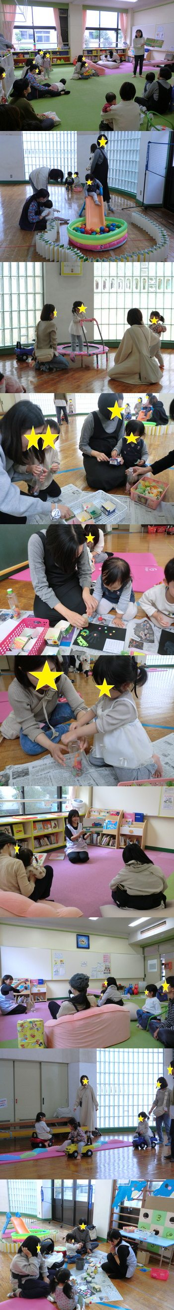 0歳~3歳の子まで楽しめる絵本を何冊か読みました。みんなおもちゃで遊びながらも、視線は絵本に向いていて、ちゃんと静かに話を聞くことができていました☆ 絵本の後は遊戯室に移動をし、トランポリン・すべり台・バランスブロック・ボーリング・キッズカー・山登り・製作といった各コーナーを準備しました。 1~3歳児が多かったので、みんな順番を守りながら楽しく仲良く遊ぶことができていました(*^-^*) 今回の1番人気はキッズカーでしたよ! 製作はカレンダーとマラカスを作りました。 12月のカレンダー作りでは、たくさんある飾りの中から好きなものを選び、クリスマスらしい可愛いカレンダーを作ることができました☆ 手形・足形スタンプも色を考えながら、楽しく押すことができていました! 他にも、秋らしく枯れ葉とどんぐりを使ってマラカス作りをしました。 音に興味を持つ子がたくさんいて、クラフトカットしたパーツを1つずつボトルの中に入れて楽しくマラカスを作ることができました☆ お家でも楽しく鳴らして遊んでみてくださいね♪ |