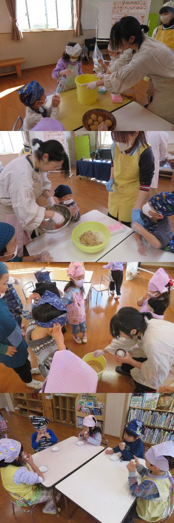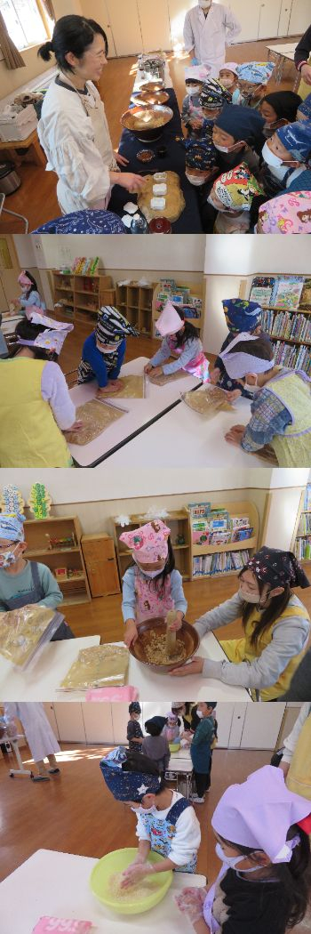 味噌作りをしました。ホールに入ってくると「何かいいにおいがする」「味噌作りなんてゆめみたい」と話しながら、期待を膨らませて取り組む子どもたちの姿が見られました。