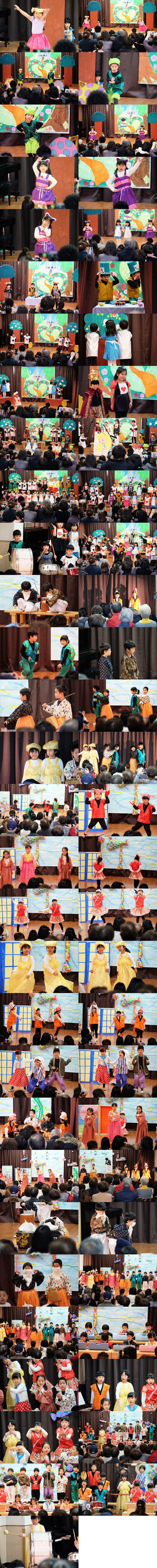 友だちとやり取りを楽しんだり、大きいクラスになると 『この場面はこうした方がいいんじゃないかなぁ』 『台詞はこうしない?』 『ダンスをしたいから、私たち自分たちで振り付けるね』 『アイドルになったみたい!!』 などお互いに思いを伝え合いながら、やり取りを楽しんでいました。 一つの絵本や話からイメージを膨らませ、子どもたちによって話がどんどんプラスされていきました。 劇で使う小物や背景をどう飾るのかなども、子どもたちが考え自分たちで作りました。 発表会は、【見てもらいたい】という子どもたちの気持ちが表れていたように思います。 どの子も充実感でいっぱいの良い表情をしていました。 「緊張したでしょう?」 と話すと年長組の子どもたちは 「ぜんぜん緊張しなかった!!一年間ありがとうっていう気持ちでやった」と誇らしげな笑顔。 まさしくスター!! ■プログラム■ ★0歳児 【おへんじできるかなぁ】 絵本から【だるまさんが】【わぁお】 ★1歳児 ごっこあそび【てぶくろ】 ★2歳児 劇遊び【やぎとトロルのものがたり】 ★3歳児 劇遊び【ももたろう】 歌【さんぽ】 合奏【ミッキーマウス・マーチ】 ★4歳児 劇遊び【ふしぎな国のアリス】 歌【やんちゃなヒーロー】 合奏【Happiness】 ★5歳児 劇遊び【うらしまたろう】 鍵盤ハーモニカ【子犬のマーチ】 歌【パプリカ】 合奏【喜びの歌】 |