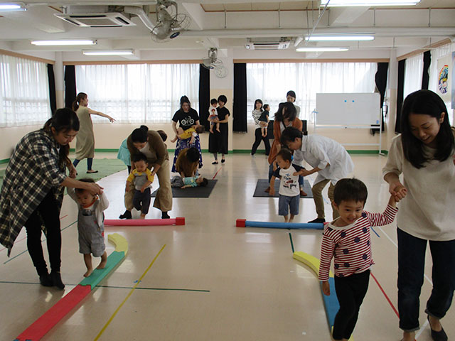 10月7日のらっこでは、ミニミニ運動会を行いました。準備運動をしてから、お母さんの足の上にのって、ペンギン歩き。落ちないように、お母さんは慎重です。ボールを一緒に持ったり、二人で挟んだりしながらコーナーを回ります。