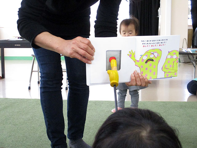 お面や、指差し棒を使った参加型の読み聞かせでは、ママがゴリラのお面をつけると「わぁ~ ママゴリラだぁ~」と盛り上がり、笑顔でいっぱいの楽しい読み聞かせの時間になりました。