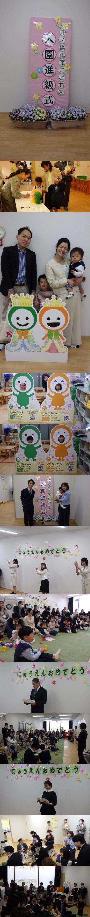 お天気が心配されましたが、ご来場いただく時間には雨は降らず、入園式を迎えた皆さんは大変いい笑顔で記念撮影をされてから、入園式に参加されました。式典では、春らしくチューリップの歌をうたったり、春の生き物を題材にした可愛らしい手遊びをしたりと、ほのぼのとした雰囲気の中スタートし、園長・保護者会長様のご挨拶、担任紹介や仮園舎ルームツアーなどを行いました。 法人側からは、入園式の記念にと「なごみちゃん&ひかるちゃん顔はめパネル」「なごみちゃん&ひかるちゃん100周年Ver.パネル」が届き、入園式看板や在園児さんが用意してくれたお祝いパネルと共に、お写真スポットとしても大人気でした♪ 令和8年度は、園児さん114名・職員42名でスタートします!今年も一年、どうぞよろしくお願いいたします☆ |