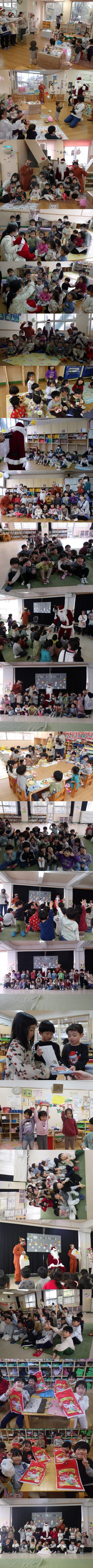 大きな袋の中には、夢とプレゼントが詰まっています。子ども達も本物のサンタさん登場にビックリ!まずは、たんぽぽ組・ちゅうりっぷ組・すみれ組を順に回り、プレゼントを渡ししながら、記念に「はいチーズ♪」その後ホールでは、ばら組・きく組・さくら組さんが集まってクリスマス会を開催。先生たちのクリスマスにちなんだスペシャル手品や手遊びを楽しんだり、クリスマスにちなんだ歌をみんなで歌いました。サンタさん登場後は、サンタさんに質問コーナーも開催!「好きな色は?食べ物は?」「どうやってプレゼントを配っているの?」「どうしてソリは空を飛べるの?」など、様々な質問が飛び出しました。 最後はみんなで記念撮影♪ 保護者様のお迎えの際には「今日、本物のサンタさんが来たんだよ!」とお話しているお子さんもたくさんいましたね♪ 最後にサンタさんより、みなさんにメッセージです!「来年また、みんなのステキな笑顔を見られるのを、楽しみにしているよ♪メリークリスマス!☆」 |